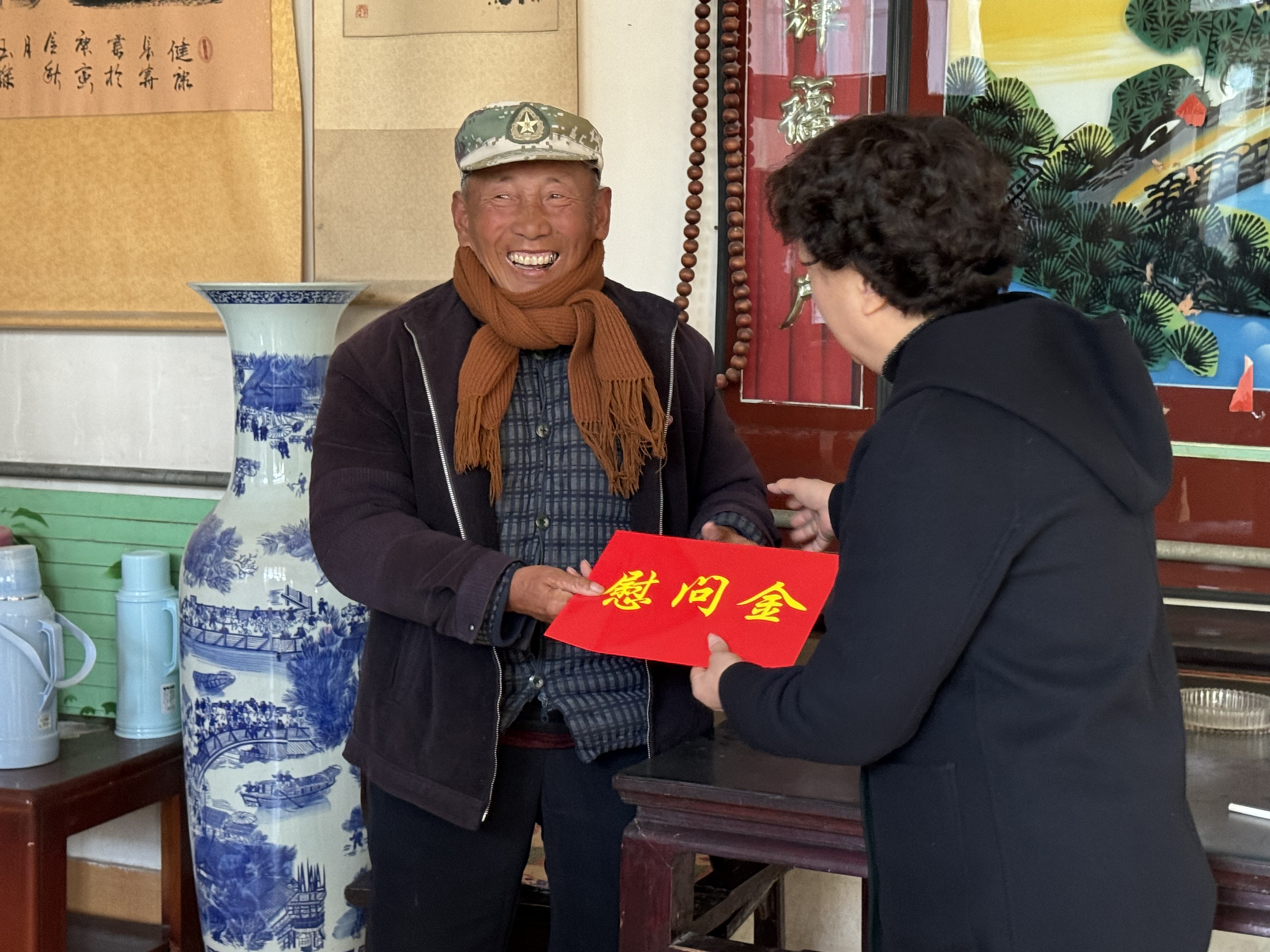 随后,赵玉辉、朱振山等同志来到了唐王街道烈士遗属李元诗家中,向李元诗一家送上了节日慰问品。赵玉辉同志首先向烈士遗属李元诗表达了深切的慰问和崇高的敬意,并与老人亲切交谈,详细了解他的家庭情况与生活状况,确保烈士遗属的生活得到妥善安排,叮嘱老人一定要保重身体并再次致以诚挚的感谢和美好的祝愿,向他传递了爱与关怀。