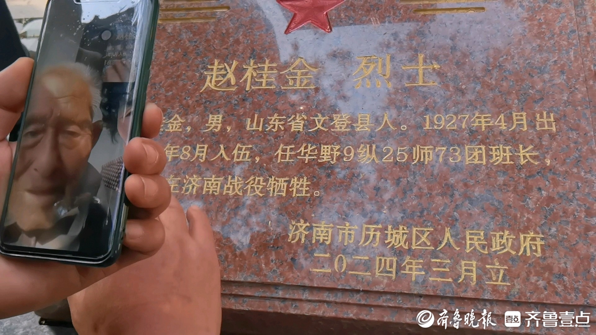 电话那头,烈士的四弟赵桂茂已经白发苍苍。电话那头,他静静地听着侄子介绍赵桂金的墓碑。“想他呀!”长久的沉默后,赵桂茂说了这么一句。毕竟77年过去了,想念的眼泪都流干了。不过,赵桂茂很庆幸在有生之年知道了二哥的消息。赵桂金烈士属于华野九纵,当时为了炸碉堡,身上绑着炸药滚向碉堡,“他被敌人给打死了,烈士纪念墙上有我哥的名字。”赵桂茂回忆说。