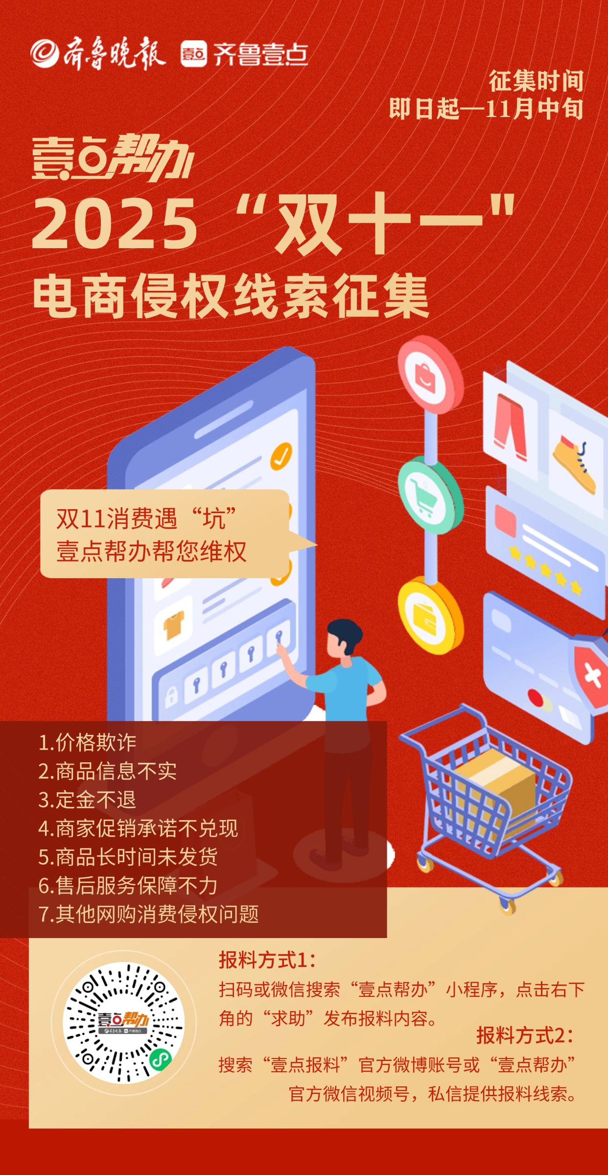 近日,随着淘宝天猫、京东等各大电商平台陆续启动双十一,2025年双十一购物节全面开启,37天的“超长待机”成为“史上最早最长”的双十一。活动期间,各类消费侵权问题不断出现,即日起,齐鲁晚报·齐鲁壹点《壹点帮办》栏目正式发起双十一电商侵权线索征集活动,面向广大消费者征集各类电商侵权线索,帮助消费者维护合法权益。