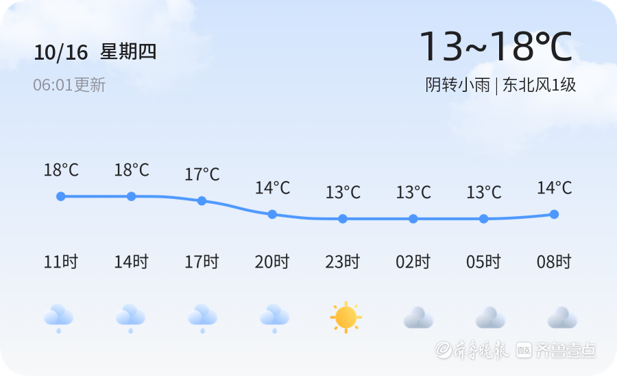 今天是10月16日,星期四,农历八月廿五。淄博市今日天气为阴转小雨,气温在13℃至18℃之间。东北风1级,空气湿度高达100%,PM2.5浓度为48微克/立方米,空气质量为良。由于天气阴雨,路面湿滑,市民出行请注意安全,建议随身携带雨具,减速慢行,确保行车安全。此外,大雾红色预警已经发布,能见度极低,市民外出需特别注意交通安全,尽量减少不必要的出行。