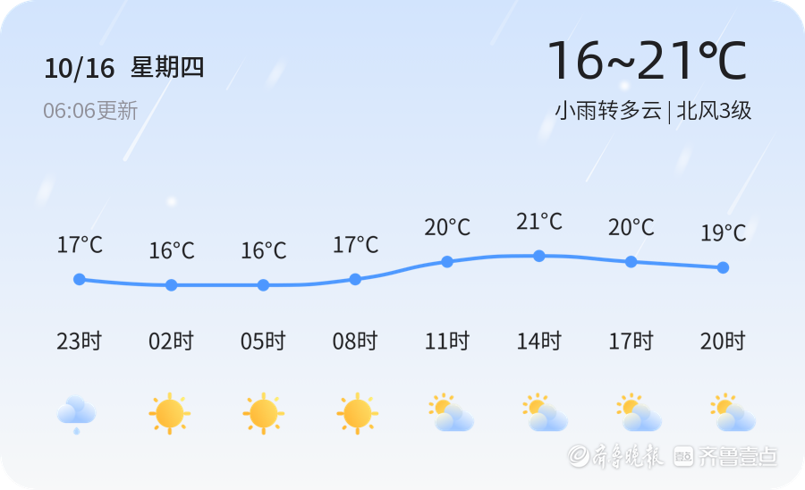 今天是10月16日,农历八月廿五,星期四。日照市今日天气为小雨转多云,气温介于16℃至21℃之间,北风3级,空气湿度为82%。PM2.5浓度为19微克/立方米,空气质量状况为优,适宜户外活动。不过,由于早晨有小雨,路面湿滑,市民出行时请注意交通安全,建议携带雨具以备不时之需。未来三天,日照市天气将以阴雨为主,气温波动较大。预计17日为多云转小雨,气温17℃至22℃;18日有中雨转小雨,气温降至13℃至17℃,北风风力将达到3-4级;19日天气转为阴天,气温10℃至15℃,北风风力略有减弱。建议市民根据天气变化及时调整衣物,雨天出行注意防滑,风力较大时等危险区域停留。温馨提示