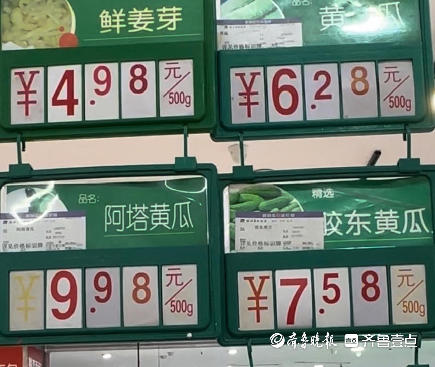 随后,记者在华联超市的蔬菜专区看到,货架上的黄瓜、西红柿、丝瓜、西葫芦等蔬菜摆放整齐、备货充足,并未出现缺货情况,但价签上的数字较此前已有明显变化。其中,黄瓜售价每斤6.28元,西红柿、丝瓜均为每斤5.98元,西葫芦每斤5.58元。