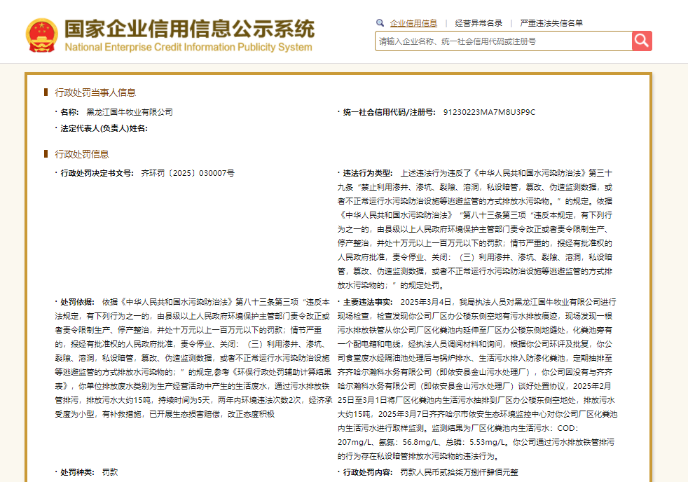 近日,齐齐哈尔市生态环境局对黑龙江国牛牧业有限公司依法作出行政处罚,罚款人民币贰拾柒万捌仟肆佰元整。该处罚决定书(文号:齐环罚﹝2025﹞030007号)已于2025年10月10日正式下达。