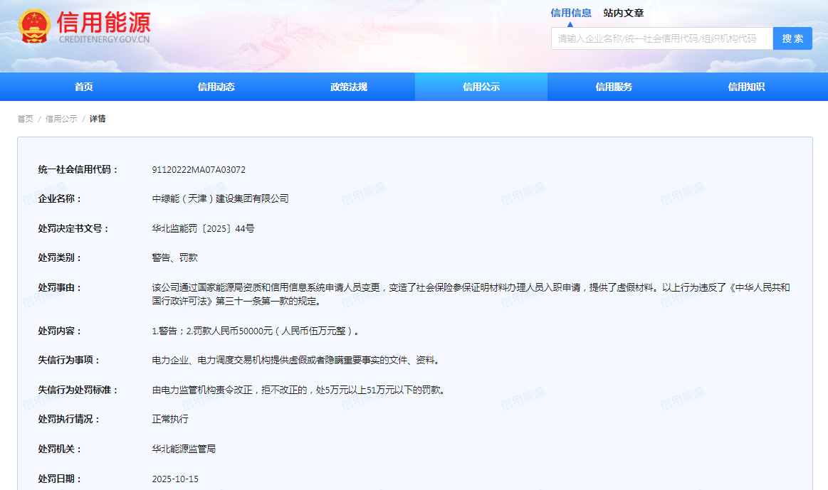 齐鲁晚报·齐鲁壹点记者于信用能源信用公示栏获悉,10月15日,中绿能(天津)建设集团有限公司收华北能源监管局罚单,处罚决定书文号:华北监能罚〔2025〕44号。