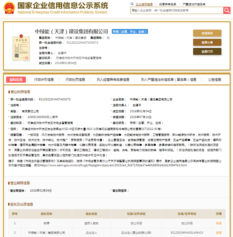 国家企业信用信息公示系统显示,中绿能(天津)建设集团有限公司成立于2016年,注册资本10000万元人民币,法定代表人为赵建平,大股东为中绿能(天津)集团有限公司,持股比例90%。