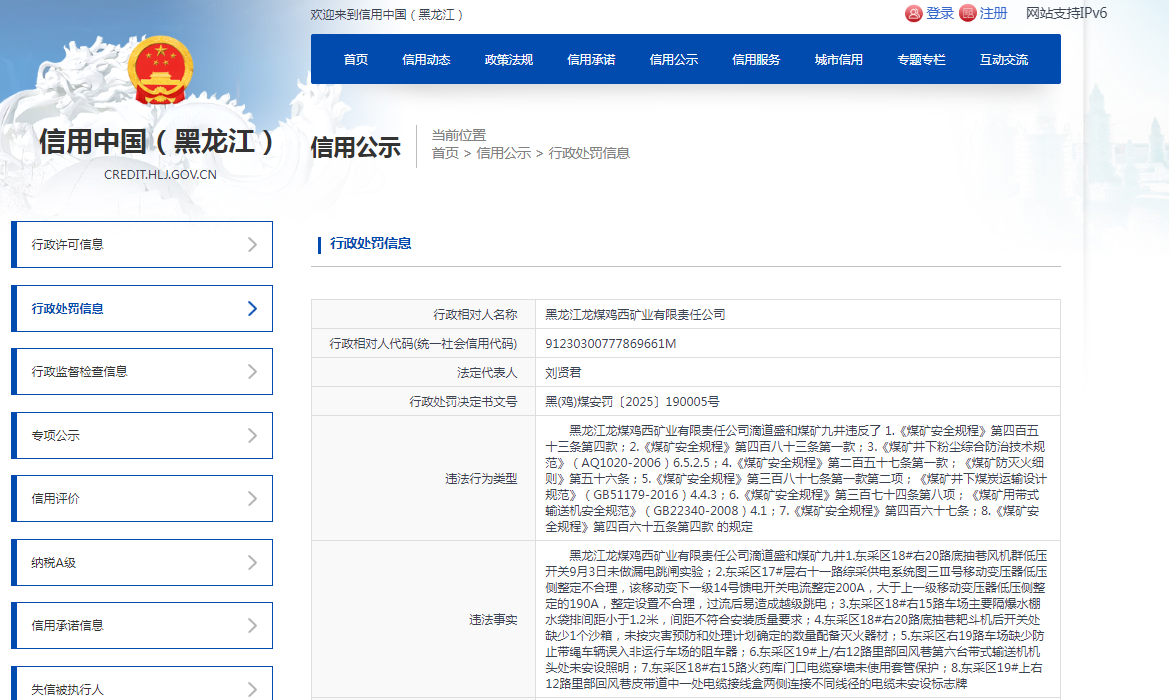 齐鲁晚报·齐鲁壹点记者于信用中国(黑龙江)信用公示栏获悉,10月15日,黑龙江龙煤鸡西矿业有限责任公司(下称“龙煤鸡西矿业”)因8项违法事实收到罚单,处罚机关为黑龙江省鸡西市煤炭生产安全管理局,处罚决定书文号:黑(鸡)煤安罚〔2025〕190005号。