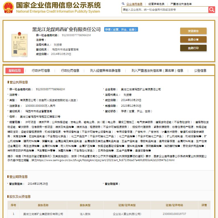 国家企业信用信息公示系统显示,黑龙江龙煤鸡西矿业有限责任公司成立于2014年,注册资本100000万元人民币,法定代表人为刘贤君,由黑龙江龙煤矿业集团股份有限公司全资持股。