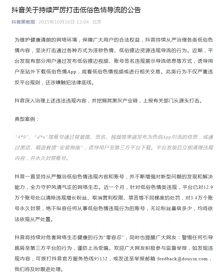 10月16日,抖音黑板报公众号发布“抖音关于持续严厉打击低俗色情导流的公告”,全文如下: