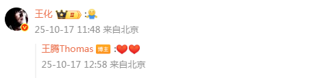 随后,小米王化在王腾评论区互动,发了拥抱表情。王腾以两个“爱心”表情包回应了王化的评论。