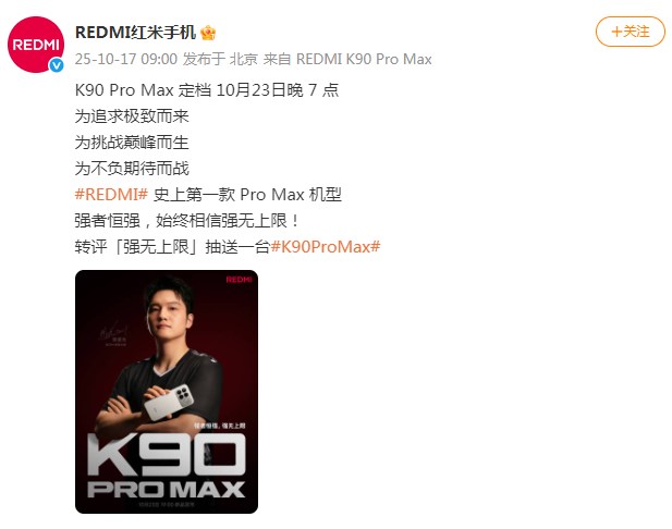 17日9点,REDMI红米手机微博宣布,将于10月23日晚7点发布K90 Pro Max,这是REDMI史上第一款Pro Max机型。