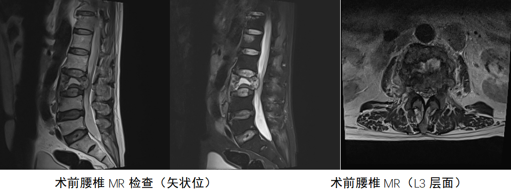 腰椎MRI(平扫+增强):L3椎体及左侧椎弓根、椎板见明显异常强化信号影,T1WI呈低信号,T2WI/STIR呈不均匀高信号,硬膜囊受压明显。