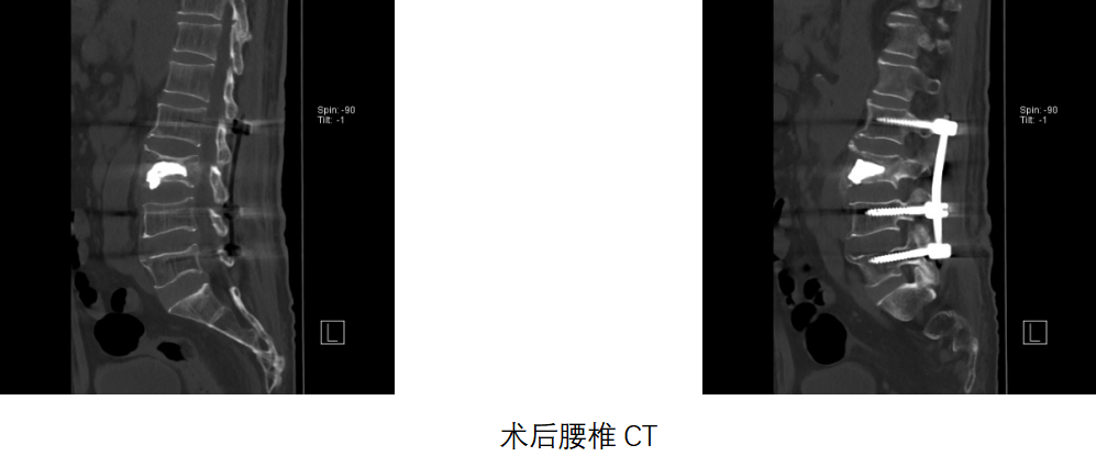 术后患者腰部疼痛明显减轻,双下肢肌力恢复至2级。术后CT示:L2-L5椎弓根螺钉位置良好,固定牢固;L3椎体内骨水泥填充满意,分布均匀。病人术后恢复满意,神经压迫症状解除后,病人进一步确诊为霍奇金淋巴瘤,现正在开展后续化疗。
