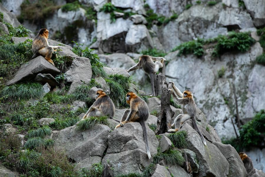 Sichuan golden snub-nosed monkeys are pictured at the Yuhe area of the Giant Panda National Park in northwest China's Gansu Province, Oct. 14, 2023. (Xinhua/Zhang Xinxin)