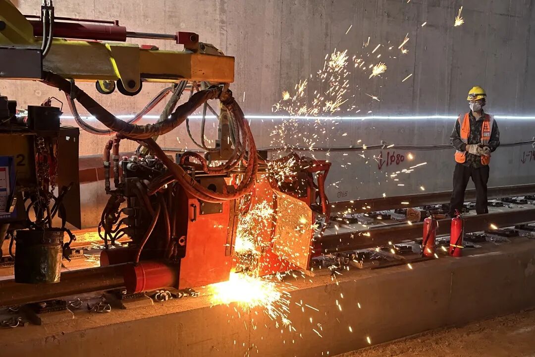 当前,济南轨道交通4、8号线及6号线东段、济南云巴加速推进通车前准备工作,济南轨道交通3号线二期也迎来最新进展——随着机场北站最后一对钢轨接头完成无缝焊接,与3号线二期工程首通段终点站机场南站的钢轨实现贯通,标志着3号线二期工程最后一站轨道铺设任务圆满完成。