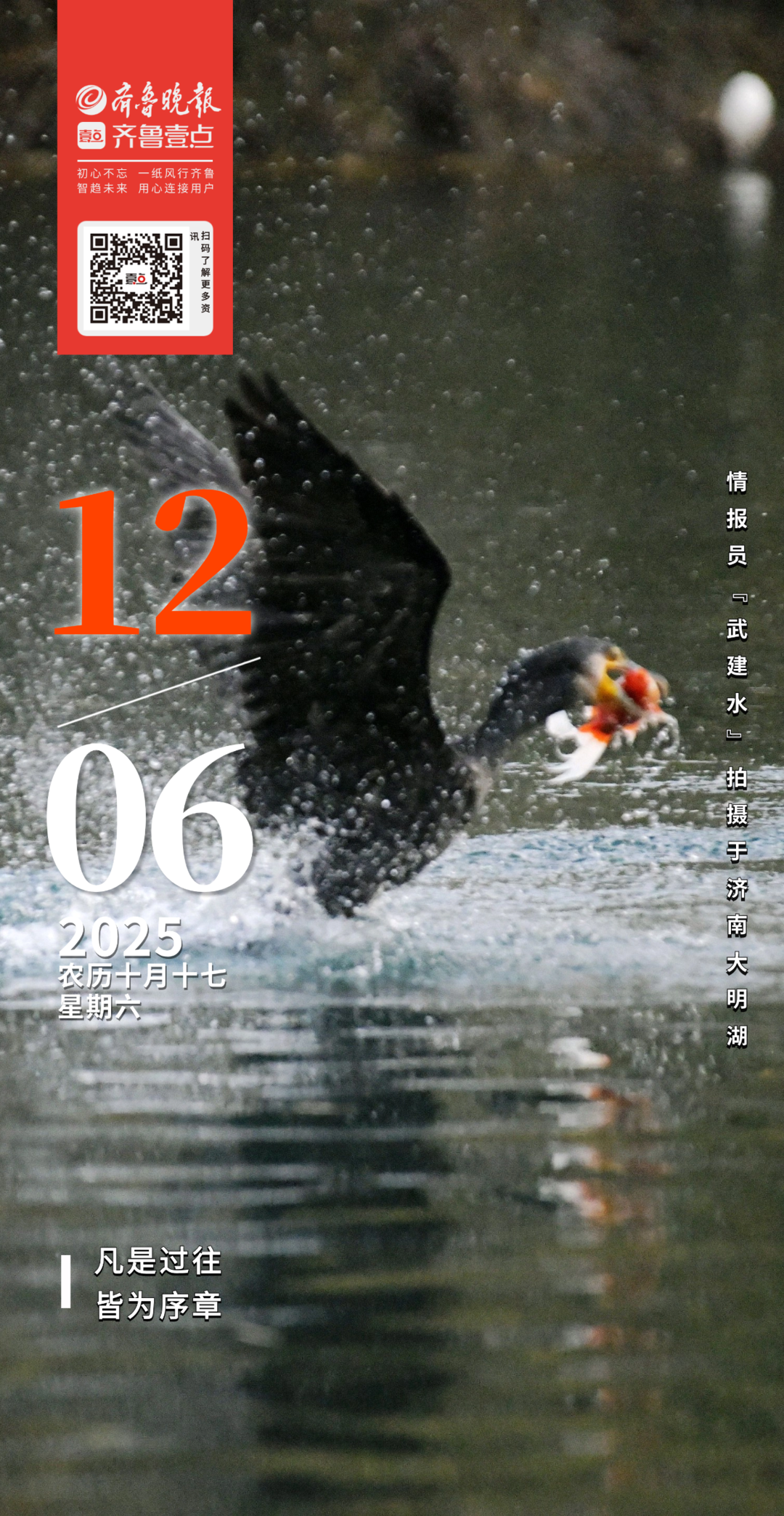 初冬济南的早晨,天还没完全亮,大明湖就已有了生机。鸬鹚那黑缎似的翅尖划过水面,溅起涟漪,喙里叼着金红色的鱼,水珠在晨光中如星子般跳跃。它们低飞、盘旋,轻唳声与水波细语交融,小鸬鹚追着抢食,让清冷的早晨热闹起来。