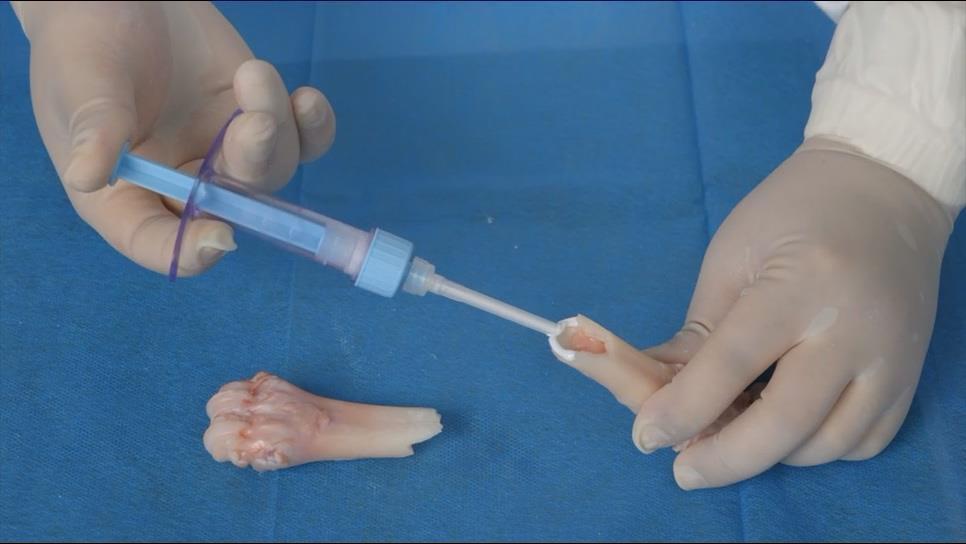 医生拿出试验用的猪骨头,涂抹在断面,然后严密黏合,等候3至5分钟后,断裂的骨头已被紧实粘住、复原。即使用锤子敲打,也纹丝不动。