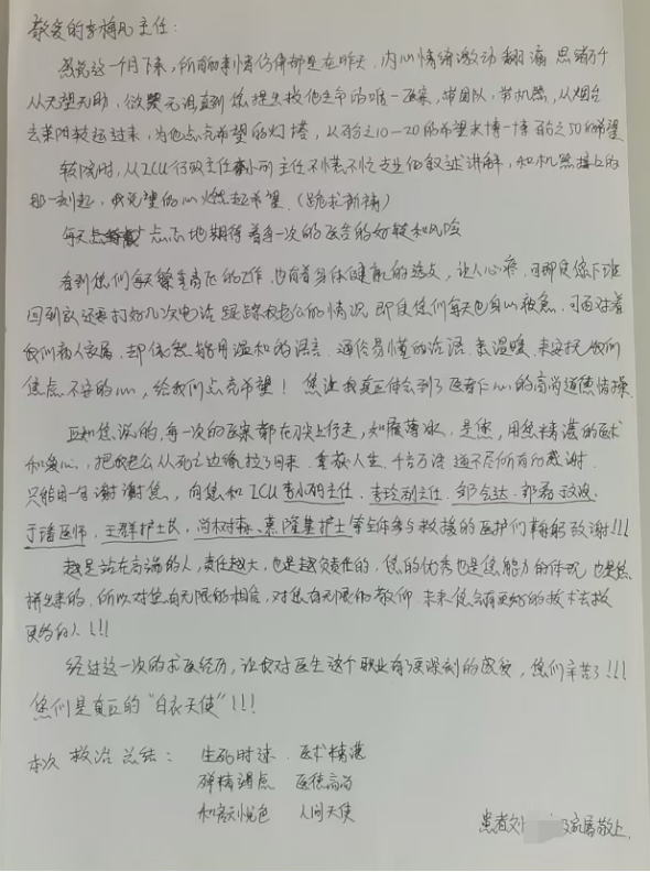 患者家属手写的感谢信