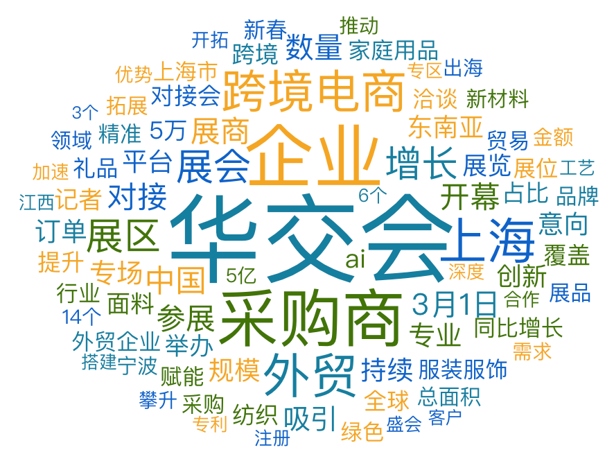词云图可以反映传播内容的聚焦点及其与活动主题的契合情况。有关第34届华东进出口商品交易会的全网传播内容词云图如下,其中关键词“华交会”的提及量排名第一,提及次数为9550次;关键词“企业”的提及量排名第二,提及次数为6193次;“采购商”的提及量排名第三,提及次数为5573次。此外,“上海、外贸、跨境电商、展会、展区、增长、中国”等都是提及量排名前十的热词。