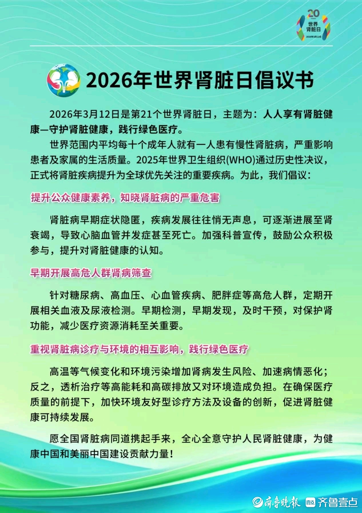 2026年3月12日(周四),我们将迎来第21个世界肾脏日(World Kidney Day)。WKD由国际肾脏病学会(ISN)发起,自2006年设立以来,已经成为全球范围内关注肾脏健康的重要公益活动。今年主题为“人人享有肾脏健康—关爱生命,守护地球”。