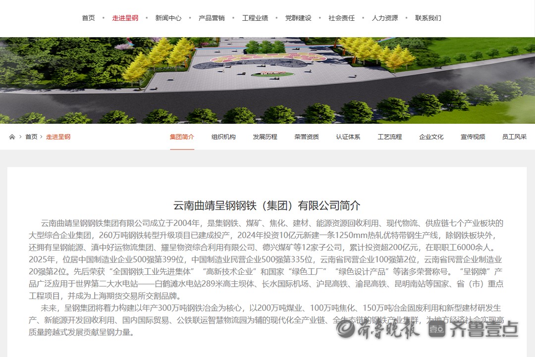 该公司官网显示,云南曲靖呈钢钢铁(集团)有限公司成立于2004年,是集钢铁、煤矿、焦化、建材、能源资源回收利用、现代物流、供应链七个产业板块的大型综合企业集团,除钢铁板块外,还拥有呈钢能源、滇中好运物流集团、耀呈物资综合利用有限公司、德兴煤矿等12家子公司,累计投资超200亿元,在职职工6000余人。2025年,位居中国制造业企业500强第399位,中国制造业民营企业500强第335位,云南省民营企业100强第2位,云南省民营企业制造业20强第2位。先后荣获“全国钢铁工业先进集体”“高新技术企业”和国家“绿色工厂”“绿色设计产品”等诸多荣誉称号。“呈钢牌”产品广泛应用于世界第二大水电站——白鹤滩水电站289米高主坝体、长水国际机场、沪昆高铁、渝昆高铁、昆明南站等国家、省(市)重点工程项目,并成为上海期货交易所交割品牌。