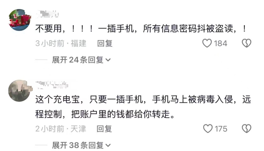 在李女士视频的评论区,不少网友提醒这可能是一种诈骗方式。有人称“来路不明的充电宝千万不能用,插入手机可能信息资料被盗走”,还有人表示自己也曾莫名其妙收到过其他物品,但根本不敢使用。