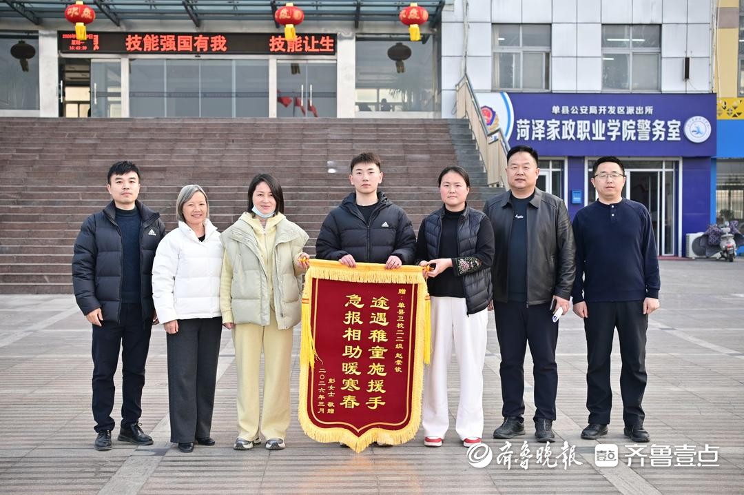 3月9日下午,牡丹区彭女士专程来到菏泽家政职业学院,将一面写有“途遇稚童施援手,急报相助暖寒春”的锦旗亲手赠予医药技术系2022级连检2班学生赵崇钦,以表达对其热心帮助走失儿童找到家人的诚挚谢意。赵崇钦同学在关键时刻伸出援手,用温暖的行动守护了孩子的安全,也以实际行动弘扬了雷锋精神,彰显了新时代青年的责任与担当,充分体现了学院在立德树人方面取得的育人成效。