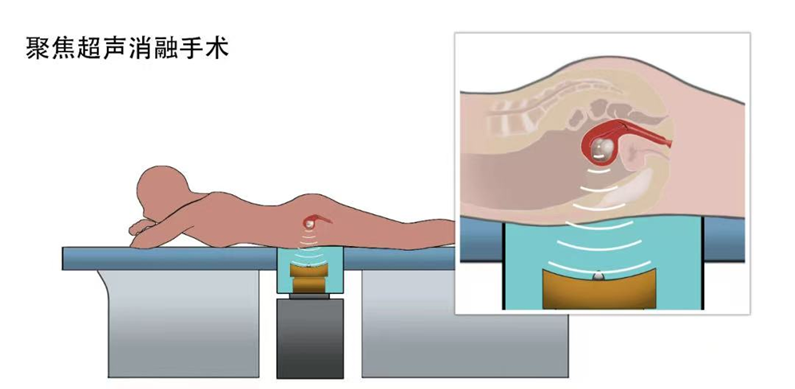 聚焦超声消融手术(FUAS)是一种非侵入性手术,治疗原理类似太阳光可以在放大镜下聚焦,焦点的高温可以点燃纸片。通过将体外发射的超声波聚焦于体内病灶上,利用聚焦超声的机械效应、热效应和空化效应,会瞬间产生65℃左右的高温,使病灶产生不可逆凝固性坏死,达到无创治疗的目的。整个治疗过程不开刀、不流血、无辐射、一次性“适形”消融、不损伤病灶之外的正常组织,同时保留正常组织器官结构和功能完整。