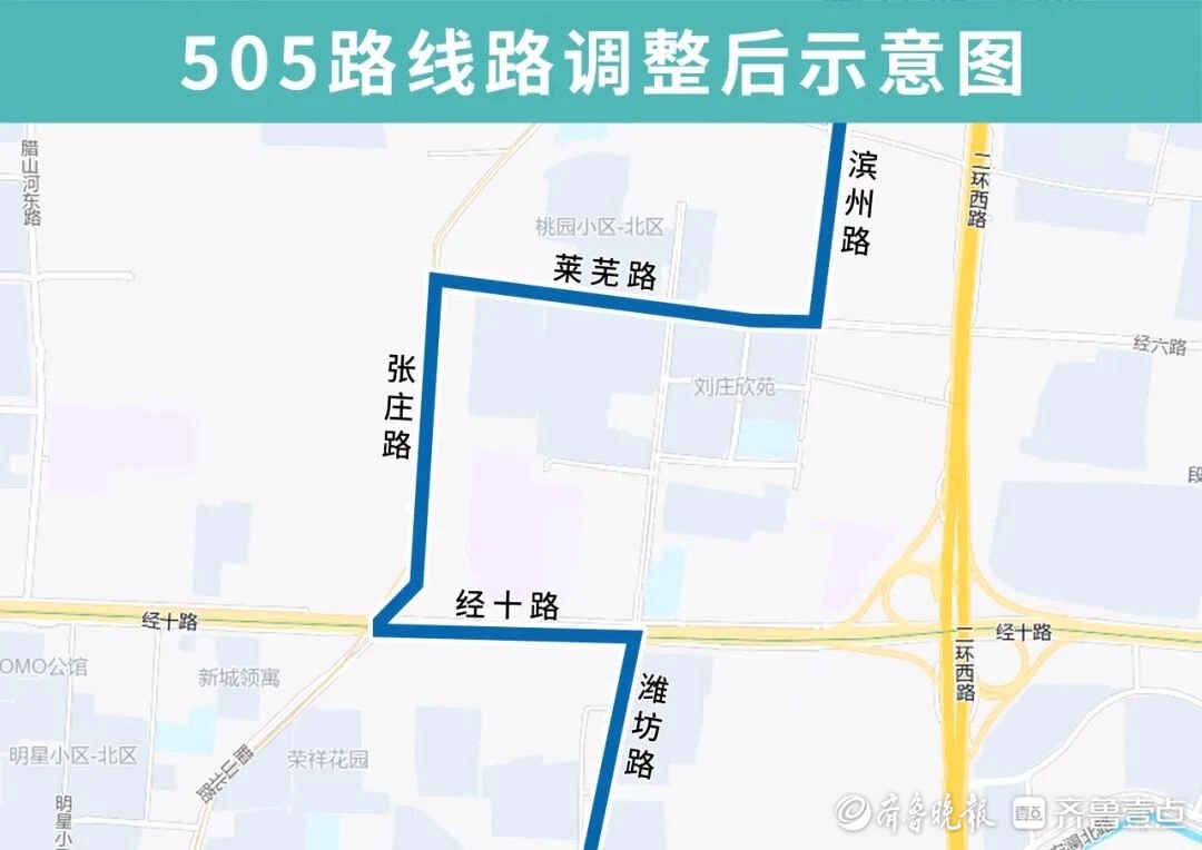 505路由重汽彩世界开往潍坊路安澜北路,优化调整后沿莱芜路向西、张庄路向南、经十路向东至潍坊路向南恢复原线,沿途增设桃园小区西、名士花园、张庄路经十路、地铁腊山站(路南)、刘庄站点,撤销潍坊路经十路站点,同时部分站点进行更名,滨州路经六路更名为滨州路莱芜路。