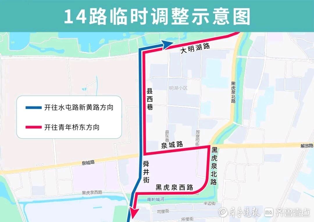 14路临时调整后开往青年桥东方向沿县西巷向南、泉城路向东、黑虎泉北路向南、黑虎泉西路向西至南门大街向南恢复原线;开往水屯路新黄路方向线路不变。临时撤销天地坛街黑虎泉西路(路西)站点,临时增设青龙桥(路南)、黑虎泉(路北)、舜井街(路北)站点。