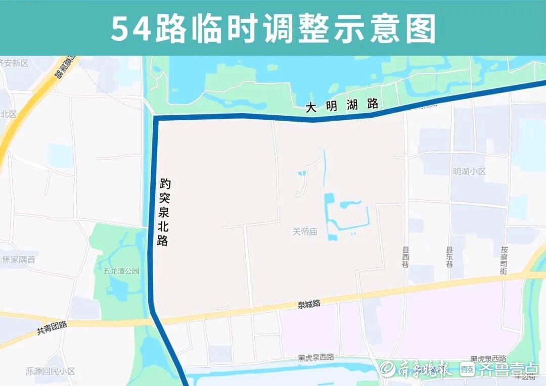 54路临时调整后沿大明湖路向西至趵突泉北路向南恢复原线,临时撤销县西巷北口、县西巷南口、天地坛街、芙蓉街、西门(路南)站点,临时增设大明湖、省府北门、大明湖西南门(同K66路)、西门(同K66路)站点。