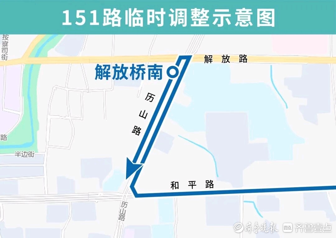 151路临时调整后由全运媒体村开往解放桥南,沿历山路向北至解放路路口调头返回,临时撤销解放桥(路北)、青龙桥南、泉城广场北(路北)、榜棚街(路东)、舜井街(路南)、黑虎泉(路南)站点。