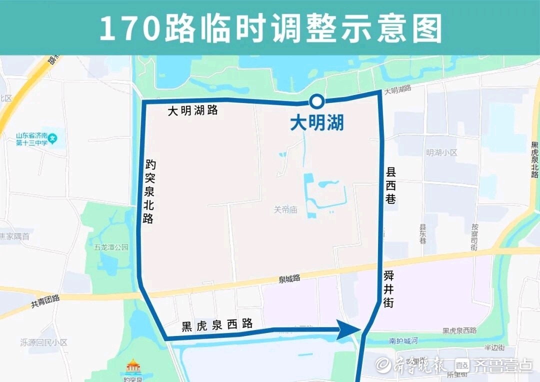 170路临时调整后沿南门大街向北、舜井街向北、县西巷向北、大明湖路向西、趵突泉北路向南、黑虎泉西路向东至南门大街向南恢复原线,临时撤销天地坛街(路北)、芙蓉街(路北)、西门(路北)、大明湖西南门(路东)、省府北门(路南)、大明湖(路南)、县西巷北口(路西)、县西巷南口(路西)、天地坛街黑虎泉西路(路西)站点,临时增设县西巷南口(路东)、县西巷北口(路东)、大明湖(路北)、省府北门(路北)、大明湖西南门(路西)、西门(路西)、趵突泉东门(路南)、泉城广场北(路南)站点。