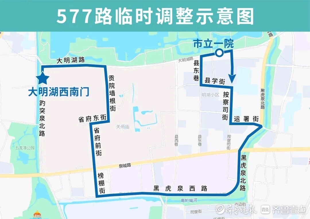 577路临时调整后沿省府前街向南、榜棚街向南至黑虎泉西路向东恢复原线,临时撤销芙蓉街、天地坛街(路北)、舜井街(路东)站点,临时增设榜棚街、泉城广场北、舜井街(路北)站点。